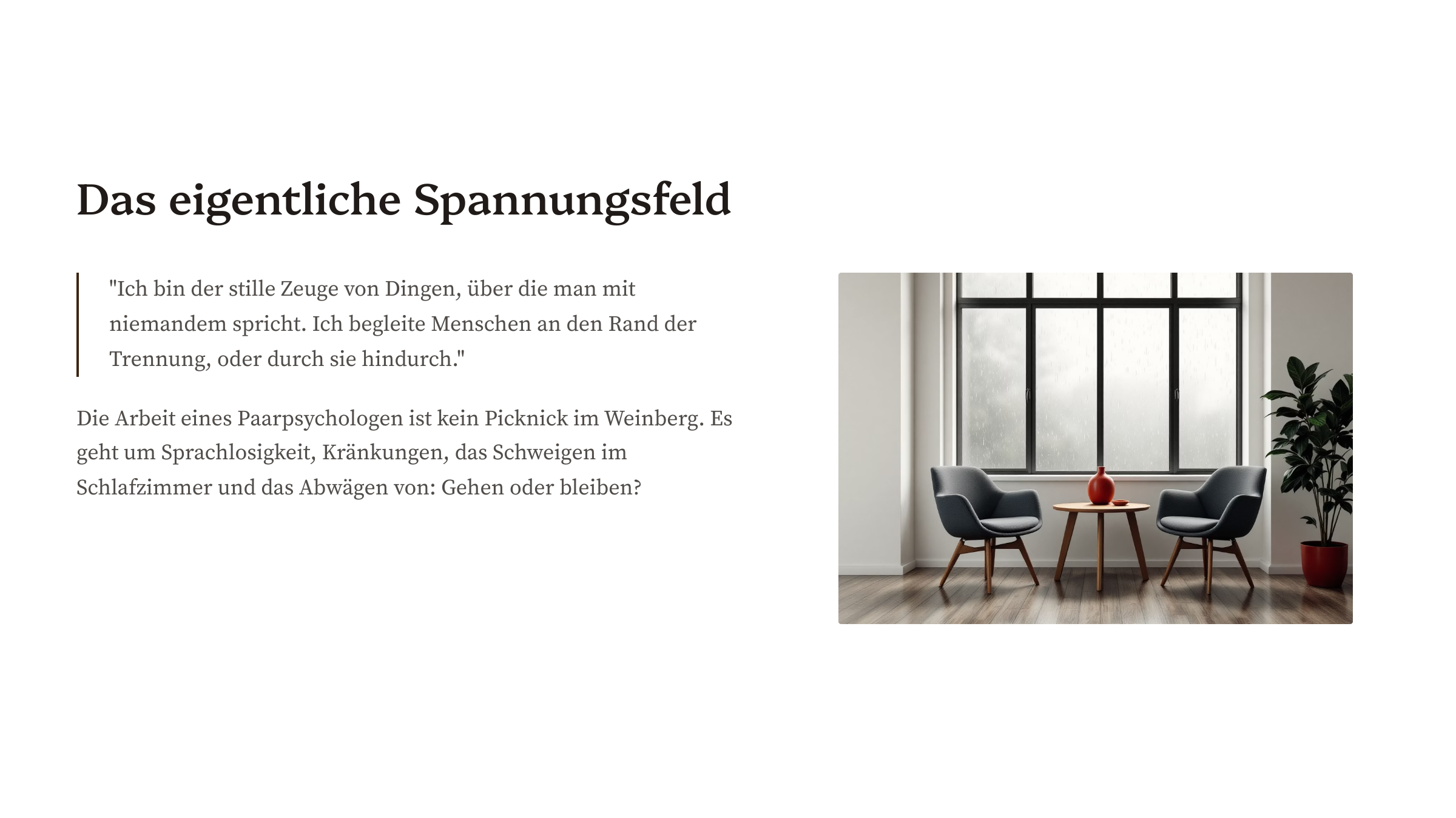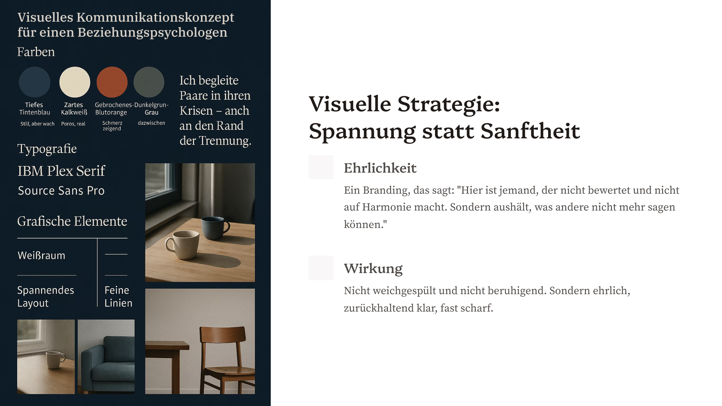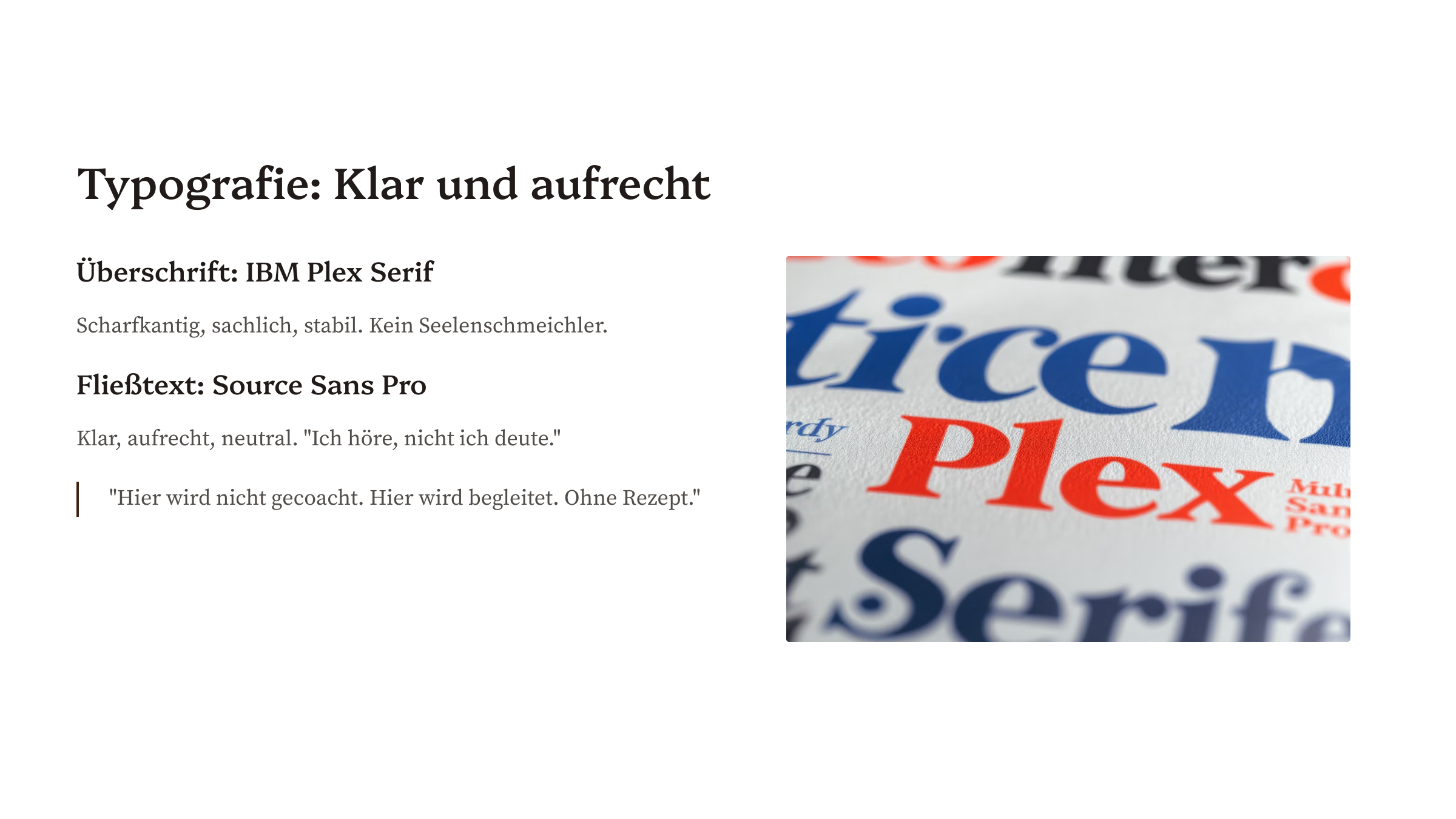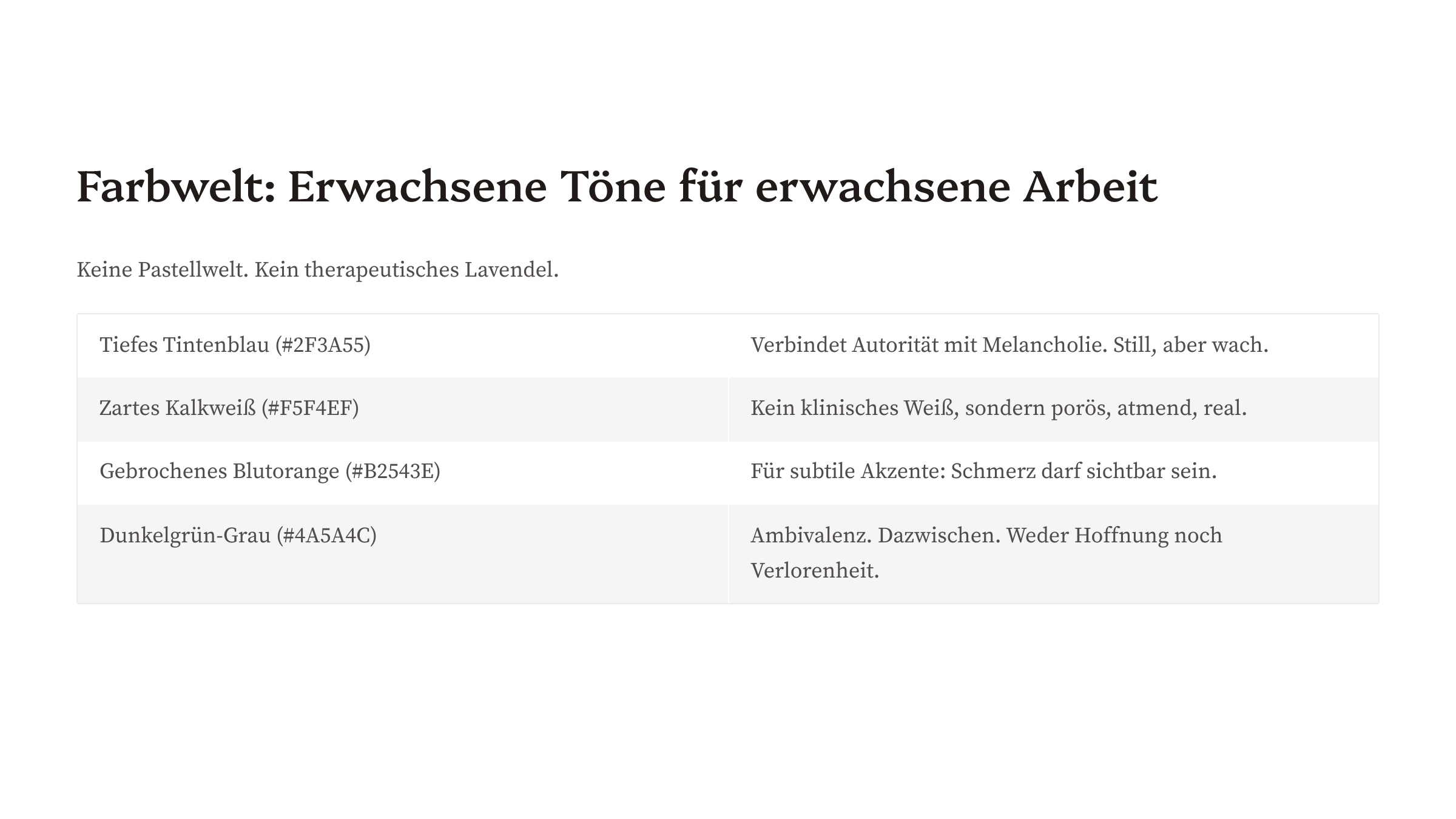 Gerade für Dienstleistungen, die Vertrauen, Nähe oder emotionale Tiefe verlangen (Psychologen, Therapeuten, Coaches), ist diese visuelle Klarheit ein Schlüssel.
